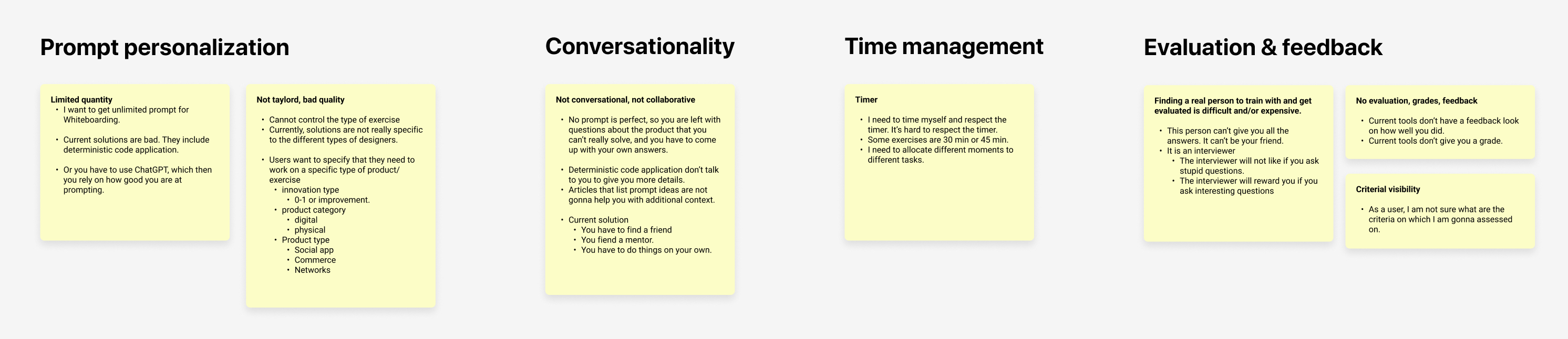 I started by going back to my notes when I was applying for Meta. I built Whiteboarding templates and took a bunch of notes about what I should do, in what order, etc. I also Googled a lot of different aspects of this part of the design recruitment process. This step was a way for me to build empathy for my users. To take notes, I like to use Figma and make Post-its. As you see below, this led me to identify 4 main problem areas.