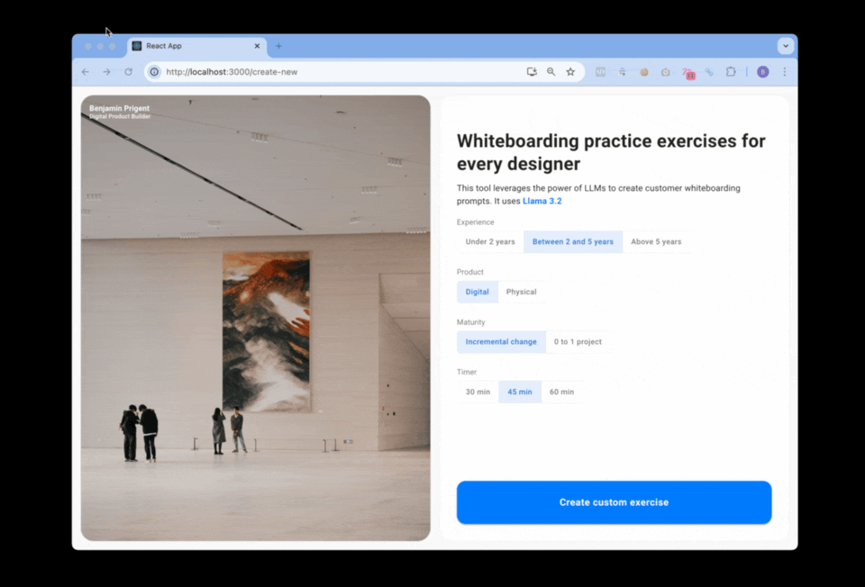 Now that I have a UI that can send a question to Llama and get an answer, I have reduced the risk in terms of feasibility. The next step will be to build an initial user flow on Figma to see how the proper first version of the tool will build.