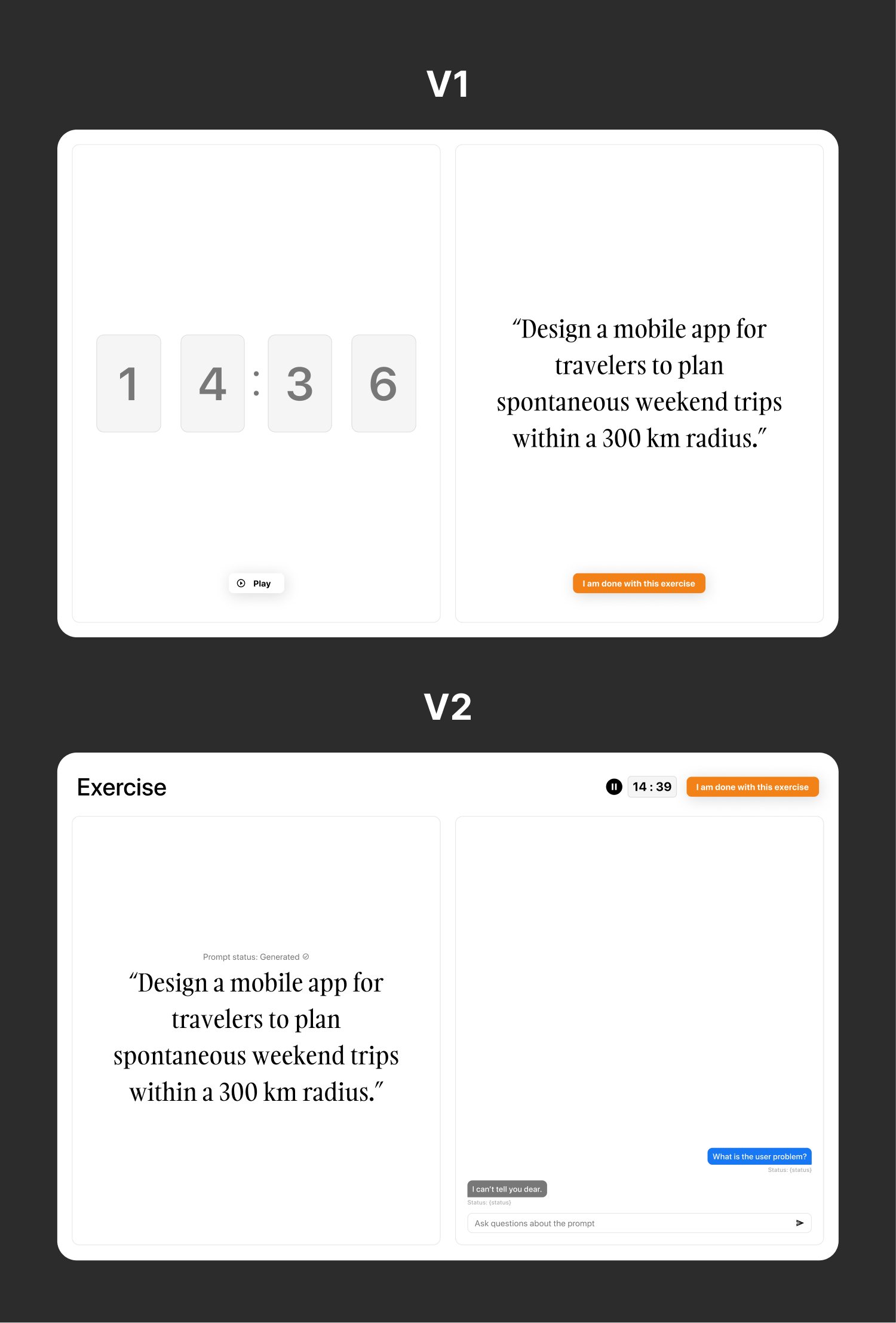 See the Figma designs below. From a 2 column system, I move to a grid with 3 sections: a header, and two columns. I moved the Cancel-CTA to the header and reduced the visual prominence of the timer and placed it in the header as well. I found that centralizing the exercise-level functions in the header made more sense and aligned with industry standards. So now, we have the exercise on the left and the chat interface on the right.